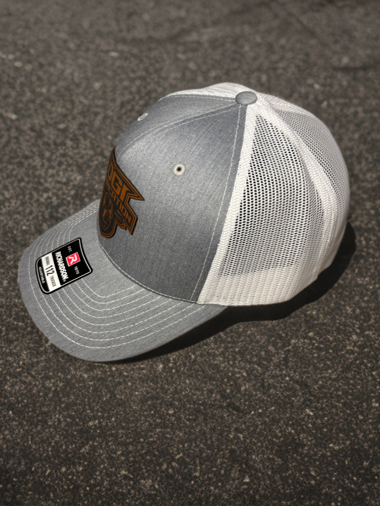 The RICHARDSON ORIGINAL 112 TRUCKER has a comfortable mid-crown, a curved visor, and an adjustable plastic snapback, with a DGI leather patch logo.